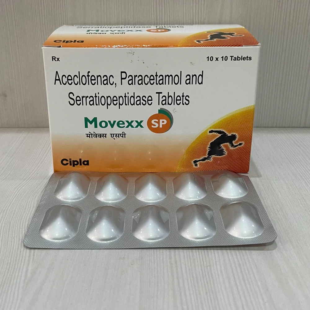 Movexx SP Tablet is used to relieve pain, swelling, and stiffness in muscles and joints. This medicine is commonly prescribed for conditions like arthritis, back or neck pain, sprains, sports injuries, and post-surgery discomfort. It is a triple-action combination of aceclofenac, paracetamol, and serratiopeptidase, which works to reduce inflammation, ease pain, and improve movement in the affected areas.
